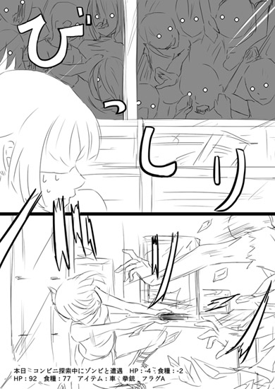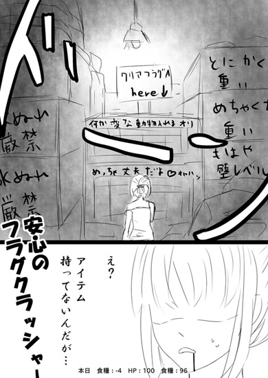 【探索】廃材の山に塞がれた通路の奥に、妙な携帯端末が落ちている。「火炎瓶」か「手榴弾」1つを消費すれば「クリアフラグA」(アイテムではない)を得る。食糧:-4