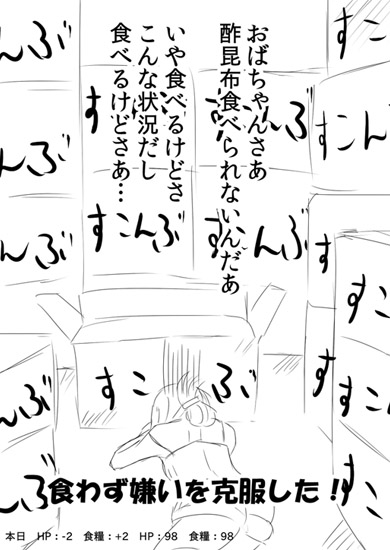 【探索】食料品店を見つけるが、荒らされた後だった。唯一、酢昆布ひと箱を発見。こんなものでも今は貴重な食糧だ。食糧:+2、捜索の疲労によって2のダメージ。
