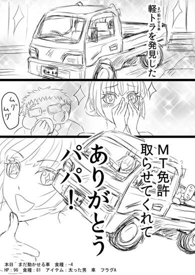 HP:96 食糧:81 アイテム:太った男 車 フラグA。